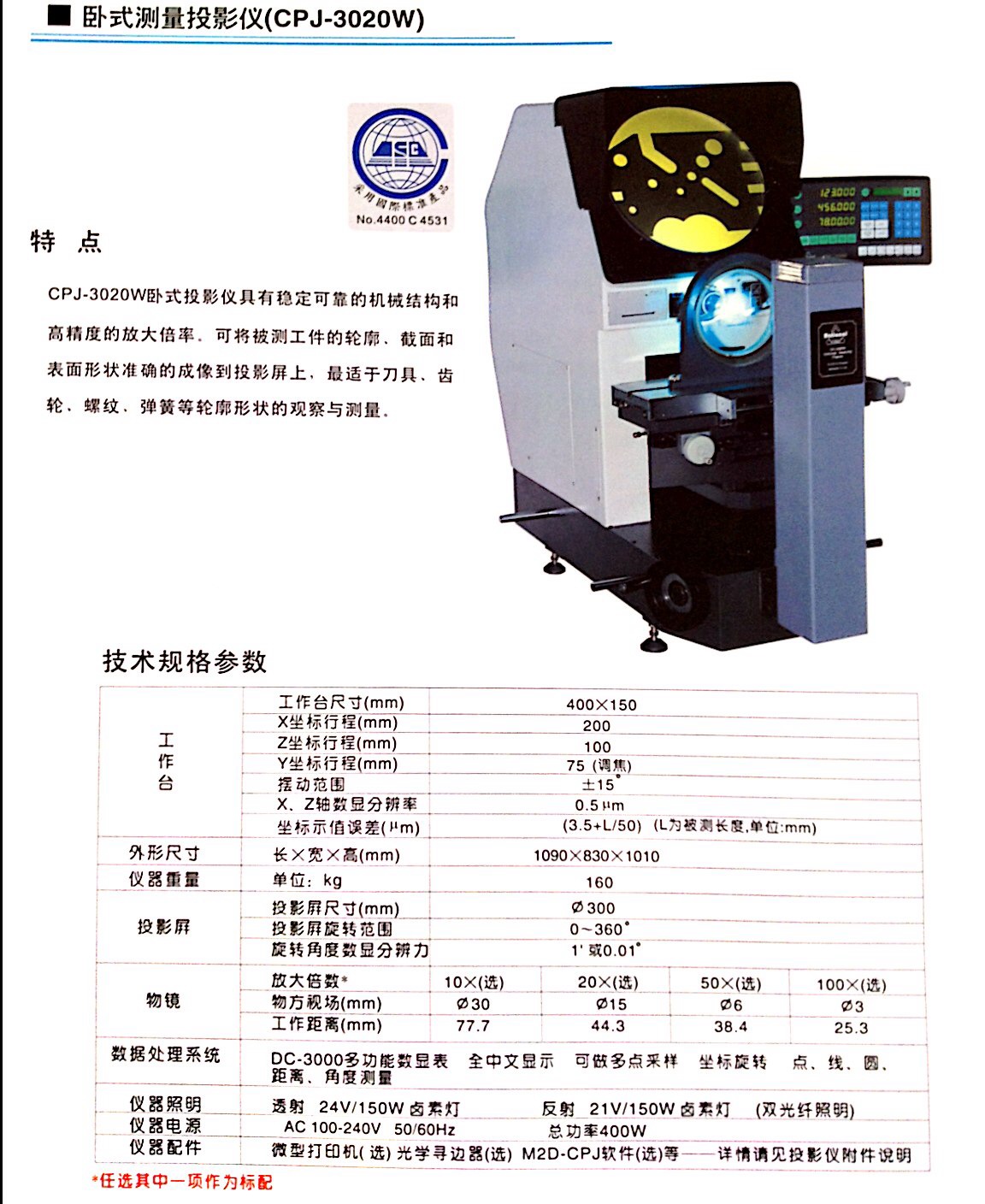 CPJ-3020W臥式投影儀具有穩(wěn)定可靠的機(jī)械結(jié)構(gòu)和高度的放大倍率??蓪⒈粶y量工件的輪廓、截面和表面形狀的準(zhǔn)確的成像到投影儀屏上,適用于刀具、齒輪、螺紋、彈簧等輪廓形狀的觀察與測量。 | |||||||||||||||||