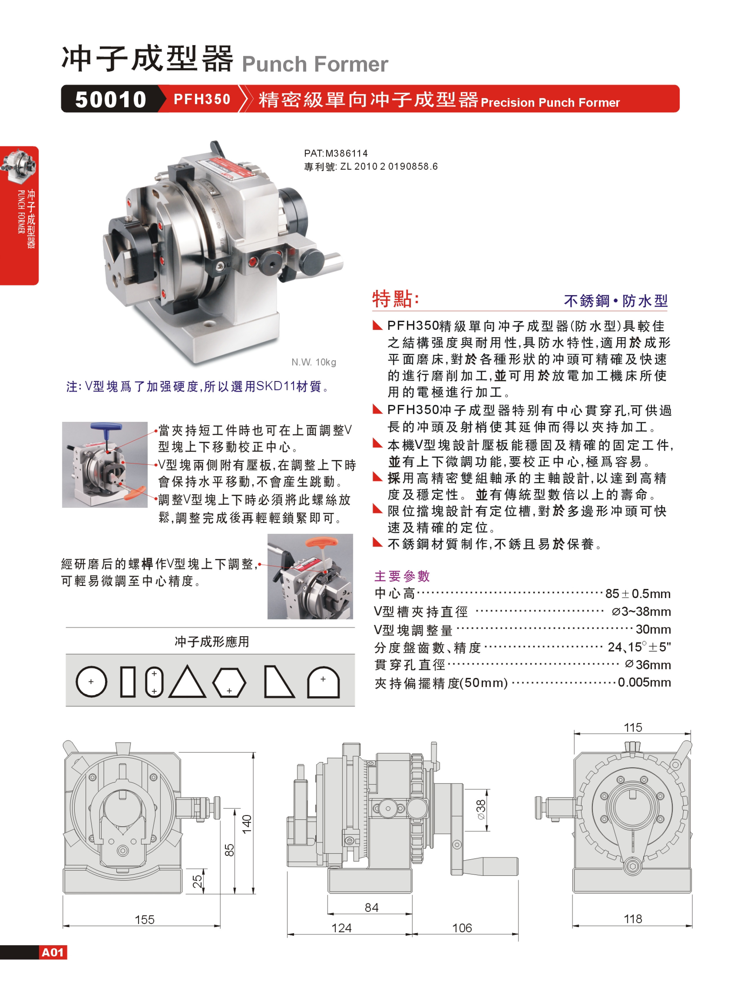 單向沖子成型器PFH350,密級具有較佳結(jié)構(gòu)強度與耐用性,具有防水特性,采用雙組密軸承主軸設(shè)計,已達到其高度和穩(wěn)定性,提高數(shù)倍使用壽命。不銹鋼材質(zhì)制造,易與保養(yǎng)。通用於成形平面磨床,對於各種形狀的沖頭可及快速進行磨削加工;中HJ可罹及快速的堪行磨削加工,量可用齡放雹加工梅床所使用的雹捏造行加工。并有上下微調(diào)功能,要校正中心,極為容易。