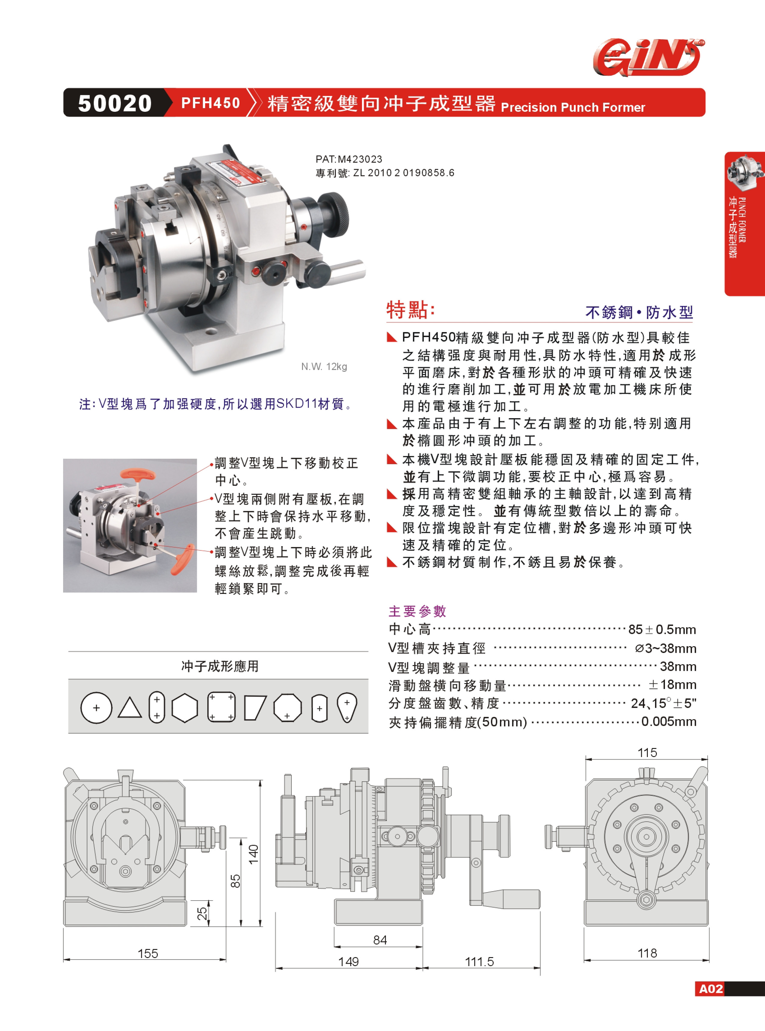 雙向沖子成型器PFH450,密級(jí)具有較佳結(jié)構(gòu)強(qiáng)度與耐用性,具有防水特性,采用雙組密軸承主軸設(shè)計(jì),已達(dá)到其高度和穩(wěn)定性,提高數(shù)倍使用壽命。不銹鋼材質(zhì)制造,易與保養(yǎng)。通用於成形平面磨床,對(duì)於各種形狀的沖頭可及快速進(jìn)行磨削加工。并有上下微調(diào)功能,要校正中心,極為容易。